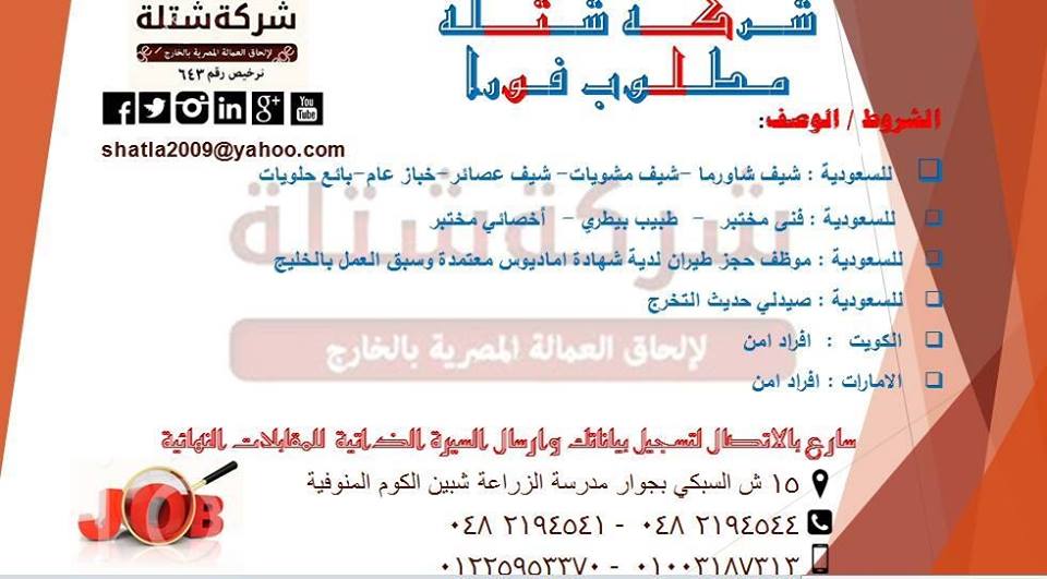 شركات في جدة تطلب موظفين 2017. شركه مقاولات تطلب محاسبين شركات توظيف في جدة للنساء. 13 شركه رائده في مجالها تطلب موظفين من الجنسين لاستكمال هيكلها الوظيفي والاداري مؤهلات عليا و متوسطه في جميع التخصصات براتب ثابت 3750 اضافه الي حوافز و تامينات اجتماعيه 01022278169 01145789076. تطلب موظفين سعوديين وغير سعوديين في جميع فروعها رجال 1 مندوب مبيعات الراتب الاساسي 1500 1800 اظافه على ذلك 25 بدل سكن 10 بدل نقل او السكن والنقل مؤمن الجدية في العمل والإلتزام المطلوب.